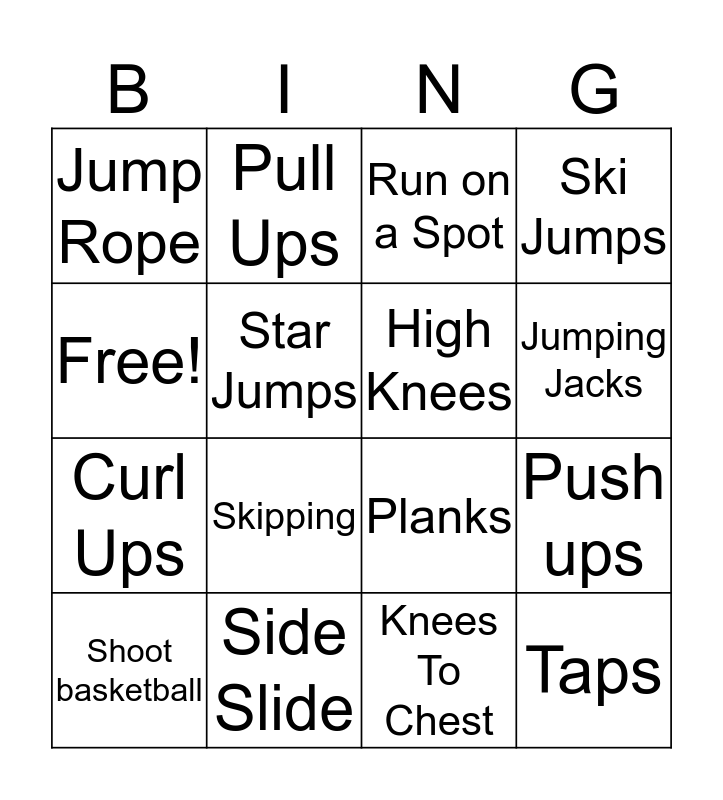 This bingo card has 16 words: Side Slide, Push ups, Run on a Spot, Jump Rope, Curl Ups, Pull Ups, Planks, Knees To Chest, Free!, Star Jumps, Shoot basketball, Ski Jumps, Skipping, Jumping Jacks, High Knees and Taps.