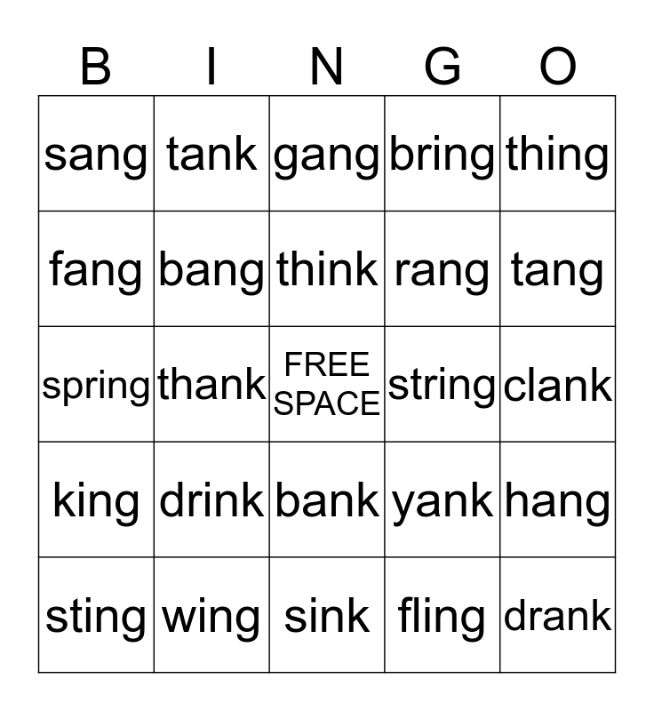 This bingo card has a free space and 25 words: drink, sink, think, sting, thing, sang, fang, tank, string, bank, rang, spring, yank, hang, bang, crank, clank, gang, tang, thank, drank, wing, king, bring and fling.