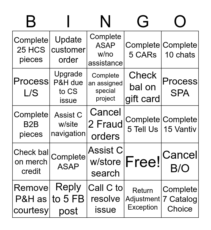 This bingo card has 25 words: Complete ASAP, Call C to resolve issue, Complete an assigned special project, Remove P&H as courtesy, Complete 10 chats, Complete 25 HCS pieces, Process L/S, Update customer order, Complete 5 Tell Us, Assist C w/store search, Check bal on gift card, Complete B2B pieces, Free!, Cancel B/O, Upgrade P&H due to CS issue, Complete 7 Catalog Choice, Complete 15 Vantiv, Complete ASAP w/no assistance, Process SPA, Assist C w/site navigation, Cancel 2 Fraud orders, Reply to 5 FB post, Check bal on merch credit, Complete 5 CARs and Return Adjustment Exception.