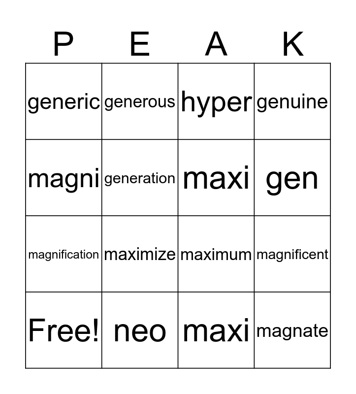 This bingo card has 16 words: neo, magnificent, hyper, generic, magnification, generous, maximum, maxi, magni, generation, Free!, genuine, maximize, gen, maxi and magnate.