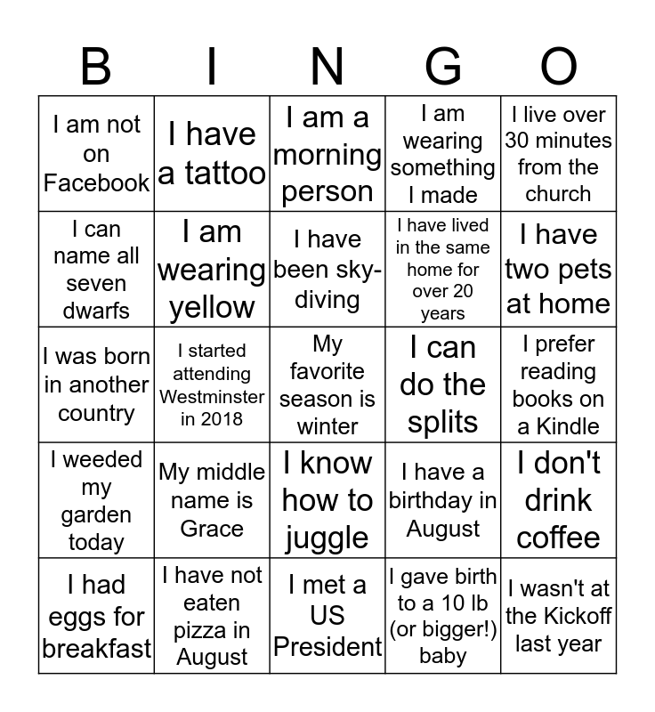 This bingo card has 25 words: My middle name is Grace, I met a US President, I have been sky-diving, I had eggs for breakfast, I live over 30 minutes from the church, I am not on Facebook, I can name all seven dwarfs, I have a tattoo, I can do the splits, I know how to juggle, I have lived in the same home for over 20 years, I was born in another country, I have a birthday in August, I don't drink coffee, I am wearing yellow, I wasn't at the Kickoff last year, I prefer reading books on a Kindle, I am a morning person, I have two pets at home, I started attending Westminster in 2018, My favorite season is winter, I have not eaten pizza in August, I weeded my garden today, I am wearing something I made and I gave birth to a 10 lb (or bigger!) baby.