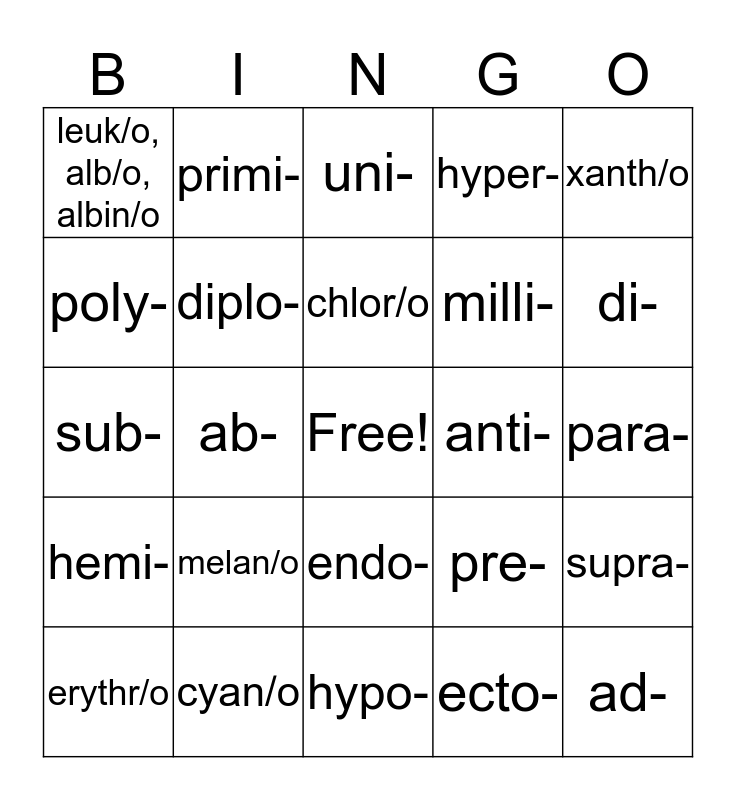 This bingo card has a free space and 24 words: melan/o, cyan/o, chlor/o, erythr/o, xanth/o, leuk/o, alb/o, albin/o, poly-, primi-, anti-, endo-, milli-, sub-, pre-, supra-, diplo-, ecto-, para-, uni-, di-, ab-, ad-, hemi-, hyper- and hypo-.