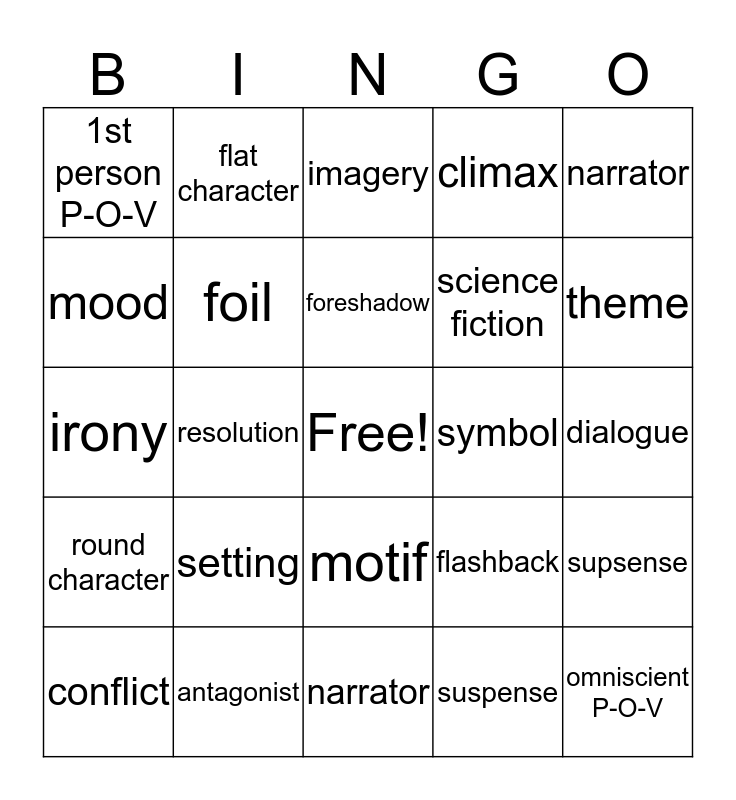 This bingo card has a free space and 24 words: setting, antagonist, foreshadow, conflict, narrator, 1st person P-O-V, mood, flat character, symbol, motif, science fiction, irony, flashback, supsense, foil, suspense, dialogue, imagery, theme, resolution, omniscient P-O-V, round character, climax and narrator.