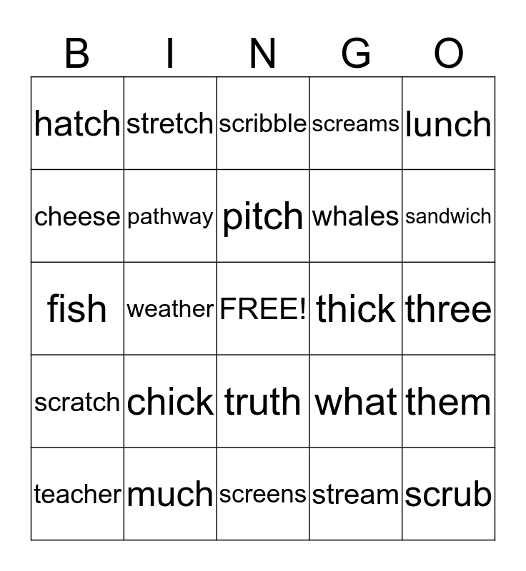 This bingo card has a free space and 24 words: chick, much, pitch, teacher, lunch, hatch, cheese, stretch, thick, truth, whales, fish, what, them, pathway, stream, three, scribble, sandwich, weather, scrub, scratch, screams and screens.