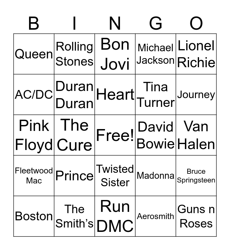 This bingo card has a free space and 36 words: Cher, Def Leppard, Cyndi Lauper, Duran Duran, Madonna, Fleetwood Mac, Heart, Scorpion, Lionel Richie, Tears for Fears, The Cure, Michael Jackson, Blondie, David Bowie, Journey, Queen, Phil Collins, Prince, Guns n Roses, Bon Jovi, Van Halen, Bruce Springsteen, The Smith’s, Boston, Run DMC, Rolling Stones, Pink Floyd, The Police, Tina Turner, AC/DC, Survivor, Elton John, Aerosmith, Twisted Sister, Whitney Houston and Billy Joel.