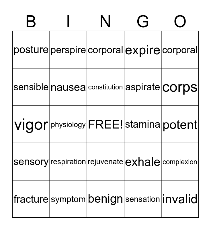 This bingo card has a free space and 24 words: respiration, symptom, constitution, fracture, corporal, posture, sensible, perspire, stamina, rejuvenate, aspirate, vigor, exhale, complexion, nausea, sensation, potent, corporal, corps, physiology, invalid, sensory, expire and benign.