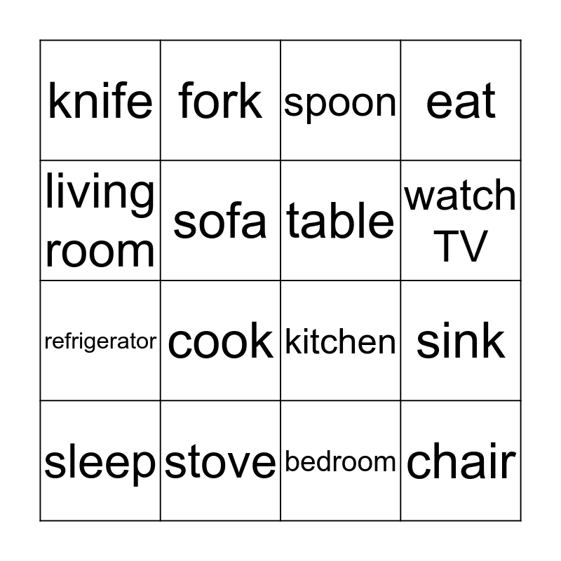 This bingo card has 16 words: stove, sink, spoon, knife, refrigerator, fork, kitchen, bedroom, living room, sofa, sleep, eat, cook, watch TV, table and chair.