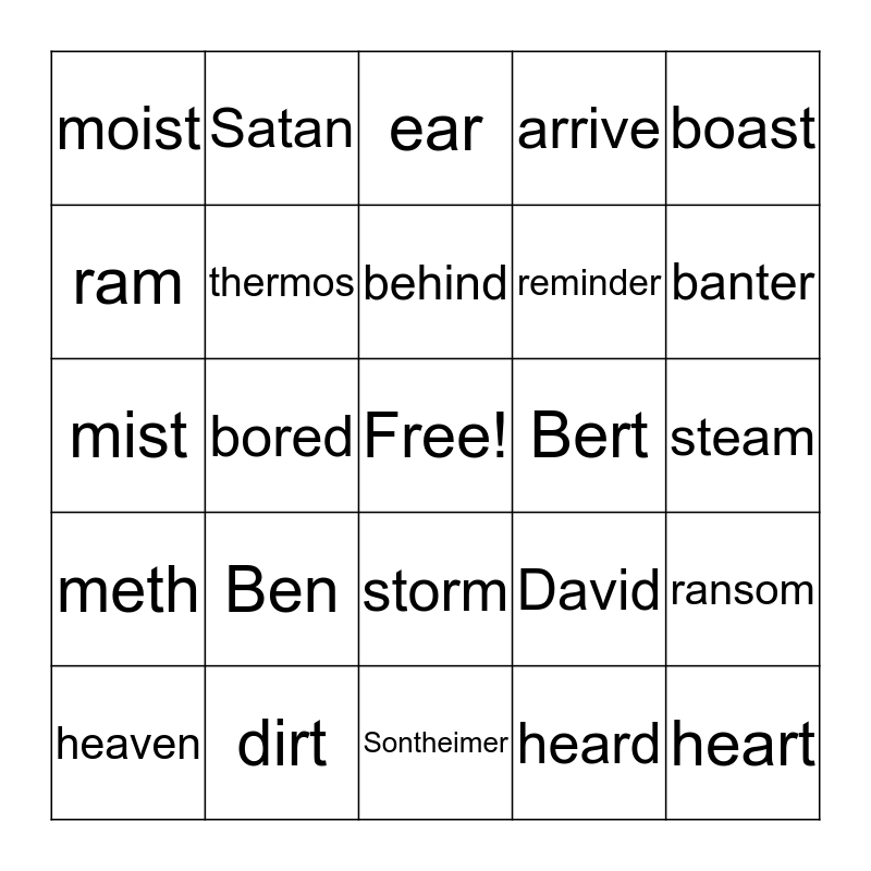 This bingo card has a free space and 24 words: Ben, dirt, behind, heaven, boast, moist, ram, Satan, Bert, storm, reminder, mist, David, ransom, thermos, heard, steam, ear, banter, bored, heart, meth, arrive and Sontheimer.