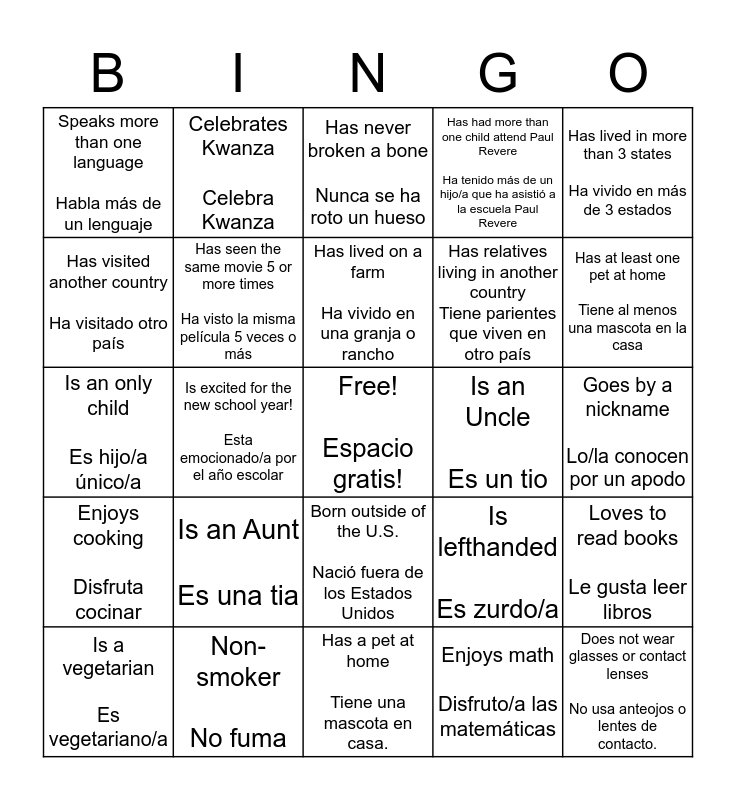This bingo card has a free space and 24 words: Is an Aunt Es una tia, Non-smoker No fuma, Has lived on a farm Ha vivido en una granja o rancho, Is a vegetarian Es vegetariano/a, Has lived in more than 3 states Ha vivido en más de 3 estados, Speaks more than one language Habla más de un lenguaje, Has visited another country Ha visitado otro país, Celebrates Kwanza Celebra Kwanza, Is an Uncle Es un tio, Born outside of the U.S. Nació fuera de los Estados Unidos, Has relatives living in another country Tiene parientes que viven en otro país, Is an only child Es hijo/a único/a, Is lefthanded Es zurdo/a, Loves to read books Le gusta leer libros, Has seen the same movie 5 or more times Ha visto la misma película 5 veces o más, Enjoys math Disfruto/a las matemáticas, Goes by a nickname Lo/la conocen por un apodo, Has never broken a bone Nunca se ha roto un hueso, Has at least one pet at home Tiene al menos una mascota en la casa, Is excited for the new school year! Esta emocionado/a por el año escolar, Does not wear glasses or contact lenses No usa anteojos o lentes de contacto., Enjoys cooking Disfruta cocinar, Has had more than one child attend Paul Revere Ha tenido más de un hijo/a que ha asistió a la escuela Paul Revere and Has a pet at home Tiene una mascota en casa..