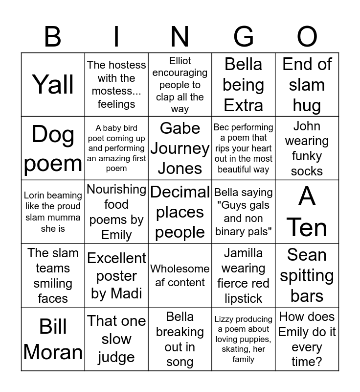 This bingo card has 29 words: Bill Moran, Lorin swooning over bill, Nourishing food poems by Emily, How does Emily do it every time?, Yall, Elliot encouraging people to clap all the way, A baby bird poet coming up and performing an amazing first poem, Excellent poster by Madi, Bella saying "Guys gals and non binary pals", That one slow judge, A Ten, Decimal places people, Bella breaking out in song, Lizzy producing a poem about loving puppies, skating, her family, John wearing funky socks, Hayley in a wide brim hat, Wholesome af content, The slam teams smiling faces, End of slam hug, Lorin beaming like the proud slam mumma she is, Jamilla wearing fierce red lipstick, Bella collapsing about food, Bec performing a poem that rips your heart out in the most beautiful way, Dog poem, Bella being Extra, The hostess with the mostess... feelings, Sean spitting bars, Gabe Journey Jones and Bees!?.