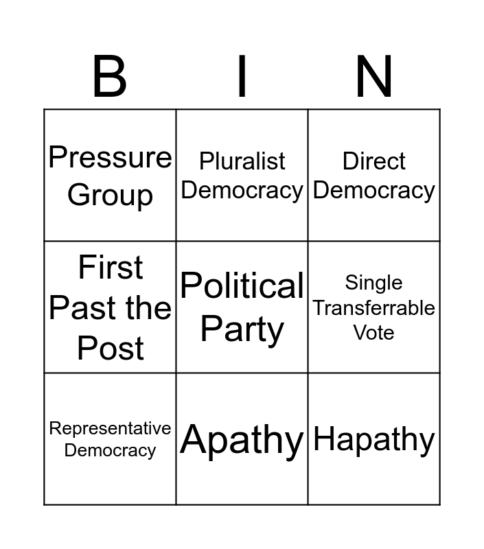 This bingo card has 9 words: Representative Democracy, Direct Democracy, Pluralist Democracy, First Past the Post, Pressure Group, Single Transferrable Vote, Political Party, Hapathy and Apathy.