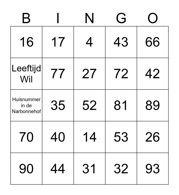 This bingo card has 99 words: Papieren bruiloft, Hoeveel kinderen hebben Wil en Agnes, 3, 4, 5, 6, 7, 8, 9, 10, 11, 12, 13, 14, Achterkleinkinderen, 16, 17, 18, 19, 20, 21, 22, 23, 24, Zilveren bruiloft, 26, 27, 28, 29, 30, 31, 32, 33, 34, 35, Huisnummer in de Narbonnehof, 37, 38, 39, 40, 41, 42, 43, 44, 45, 46, 47, 48, 49, Gouden bruiloft, 51, 52, 53, 54, 55, 56, 57, 58, 59, 60, 61, 62, 63, 64, 65, 66, 67, Trouwjaar, Geboortejaar Rob, 70, 71, 72, Leeftijd Wil, 74, Geboortejaar Daniëlle, 76, 77, 78, 79, 80, 81, 82, 83, 84, 85, 86, 87, 88, 89, 90, 91, 92, 93, 94, 95, 96, 97, 98 and 99.