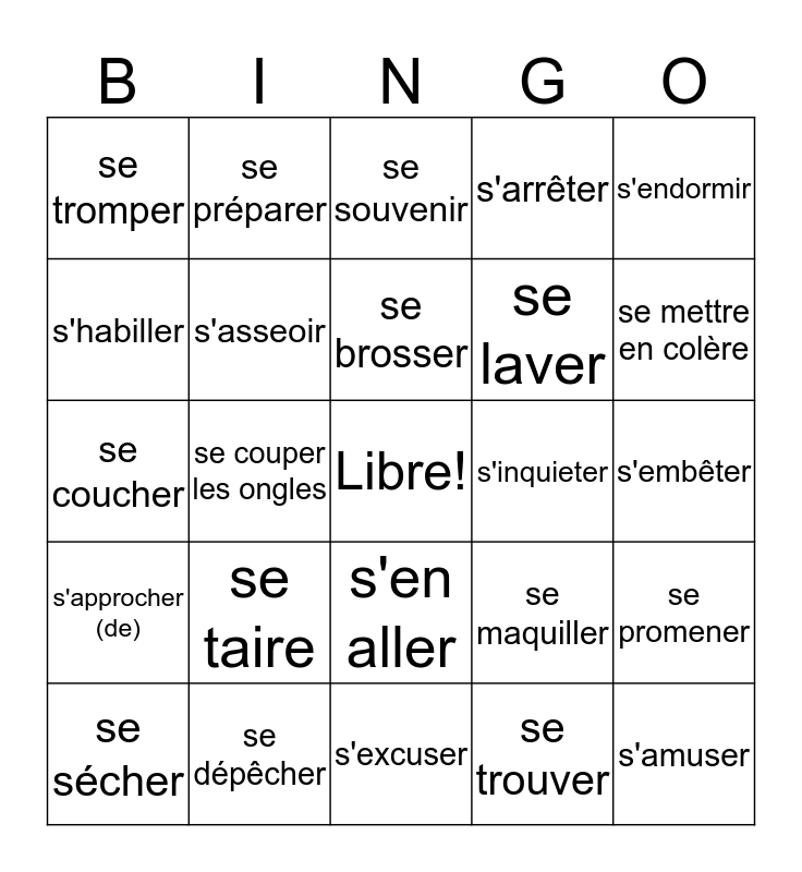 This bingo card has a free space and 29 words: se sécher, s'essuyer, se couper les ongles, s'énerver, se tromper, se souvenir, s'asseoir, se taire, s'inquieter, se dépêcher, s'embêter, s'amuser, s'excuser, se trouver, se mettre en colère, s'acheter, s'en aller, s'approcher (de), s'endormir, se coucher, se maquiller, se réveiller, se laver, s'habiller, s'arrêter, se préparer, se promener, se brosser and se peigner.