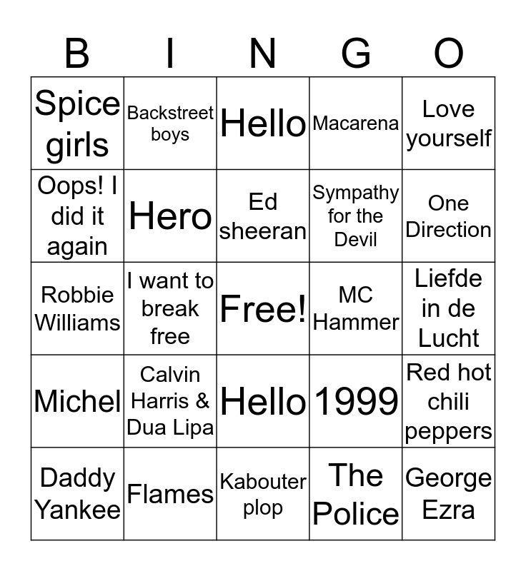 This bingo card has a free space and 24 words: Calvin Harris & Dua Lipa, Flames, Ed sheeran, Daddy Yankee, Love yourself, Spice girls, Oops! I did it again, Backstreet boys, MC Hammer, Hello, Sympathy for the Devil, Robbie Williams, 1999, Red hot chili peppers, Hero, The Police, Liefde in de Lucht, Hello, One Direction, I want to break free, George Ezra, Michel, Macarena and Kabouter plop.