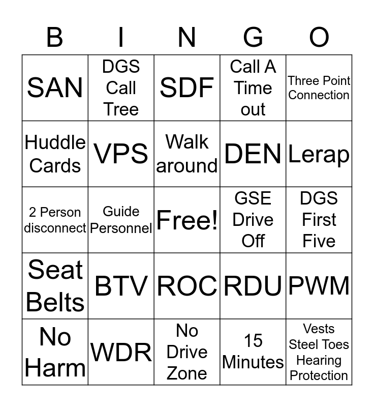 This bingo card has a free space and 24 words: BTV, WDR, Walk around, No Harm, Three Point Connection, SAN, Huddle Cards, DGS Call Tree, GSE Drive Off, ROC, DEN, 2 Person disconnect, RDU, PWM, VPS, 15 Minutes, DGS First Five, SDF, Lerap, Guide Personnel, Vests Steel Toes Hearing Protection, Seat Belts, Call A Time out and No Drive Zone.