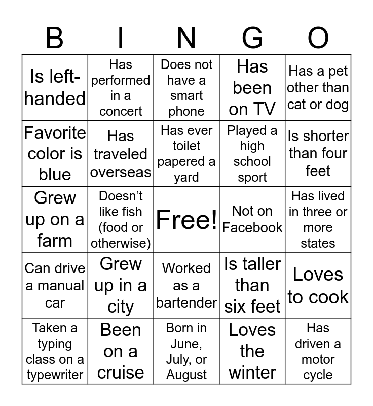 This bingo card has a free space and 25 words: Can drive a manual car, Been on a cruise, Born in June, July, or August, Loves the winter, Has a pet other than cat or dog, Is left-handed, Has performed in a concert, Does not have a smart phone, Not on Facebook, Loves to cook, Favorite color is blue, Has traveled overseas, Is an only child, Is taller than six feet, Is shorter than four feet, Taken a typing class on a typewriter, Doesn’t like fish (food or otherwise), Has ever toilet papered a yard, Played a high school sport, Has lived in three or more states, Grew up on a farm, Grew up in a city, Worked as a bartender, Has been on TV and Has driven a motor cycle.
