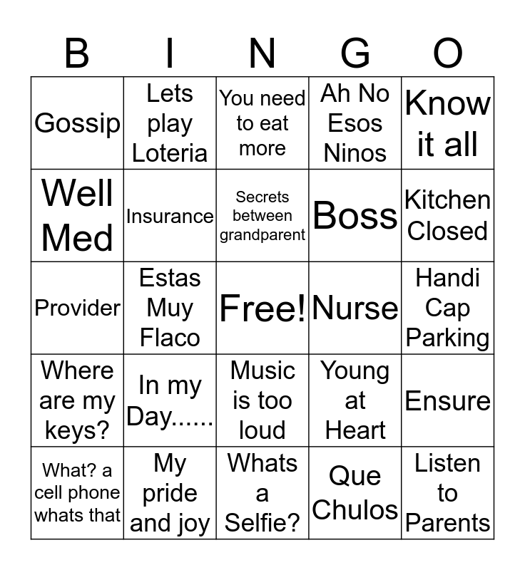 This bingo card has a free space and 24 words: In my Day......, My pride and joy, Secrets between grandparent, What? a cell phone whats that, Know it all, Gossip, Well Med, Lets play Loteria, Nurse, Music is too loud, Boss, Provider, Young at Heart, Ensure, Insurance, Que Chulos, Handi Cap Parking, You need to eat more, Kitchen Closed, Estas Muy Flaco, Listen to Parents, Where are my keys?, Ah No Esos Ninos and Whats a Selfie?.