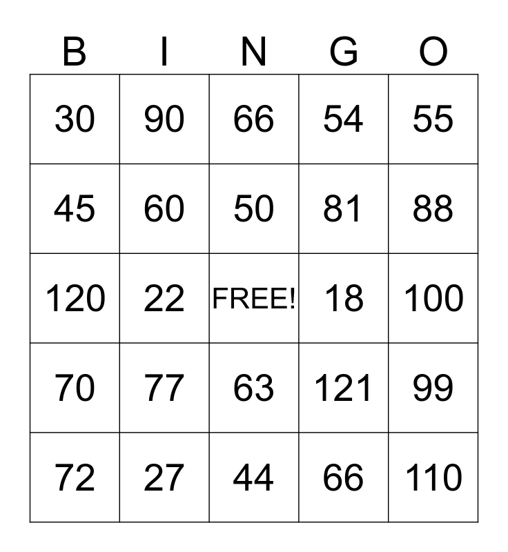 This bingo card has a free space and 24 words: 77, 27, 50, 72, 55, 30, 45, 90, 18, 63, 81, 120, 121, 99, 60, 66, 100, 66, 88, 22, 110, 70, 54 and 44.