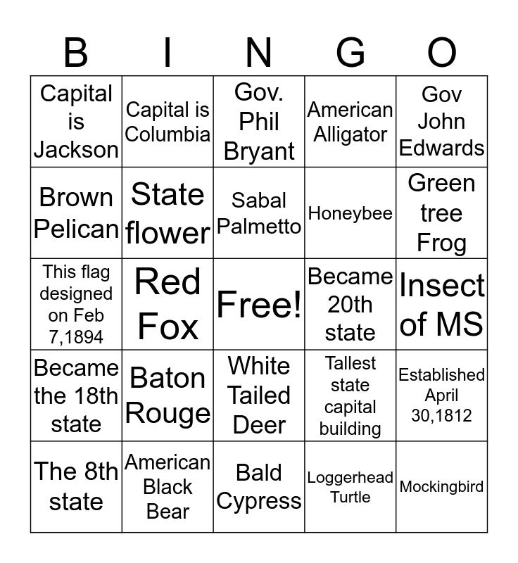 This bingo card has a free space and 24 words: The 8th state, Baton Rouge, Sabal Palmetto, Loggerhead Turtle, Gov John Edwards, Capital is Jackson, Capital is Columbia, Gov. Phil Bryant, Became 20th state, Insect of MS, This flag designed on Feb 7,1894, State flower, Tallest state capital building, Established April 30,1812, Brown Pelican, American Black Bear, Bald Cypress, American Alligator, Green tree Frog, Became the 18th state, Red Fox, White Tailed Deer, Honeybee and Mockingbird.