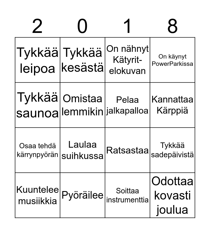 This bingo card has 16 words: Pyöräilee, Tykkää sadepäivistä, On nähnyt Kätyrit-elokuvan, Tykkää leipoa, Osaa tehdä kärrynpyörän, Tykkää kesästä, Ratsastaa, Soittaa instrumenttia, Tykkää saunoa, Omistaa lemmikin, Kuuntelee musiikkia, On käynyt PowerParkissa, Laulaa suihkussa, Kannattaa Kärppiä, Pelaa jalkapalloa and Odottaa kovasti joulua.