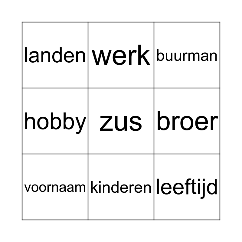 This bingo card has 9 words: voornaam, buurman, werk, hobby, landen, broer, zus, leeftijd and kinderen.