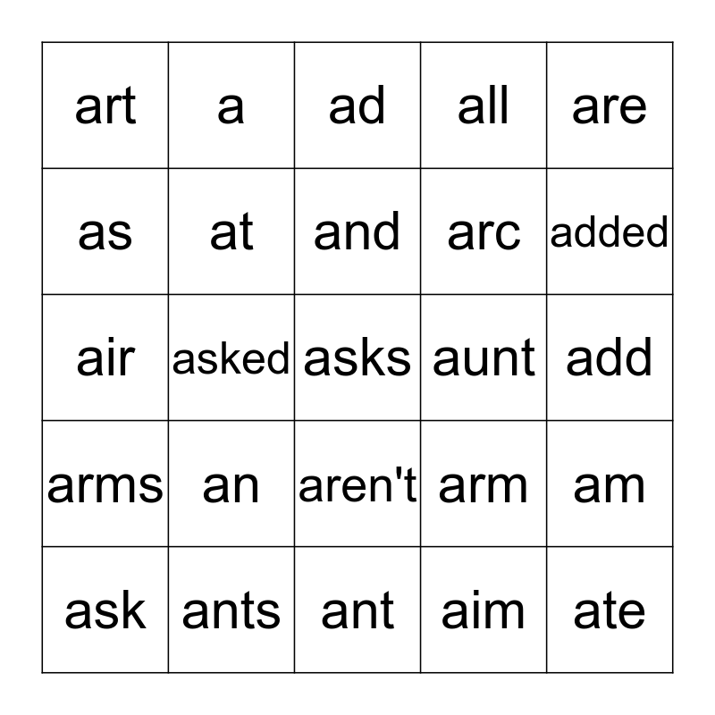 This bingo card has 25 words: an, ant, and, ask, are, art, as, a, aunt, aren't, arc, air, arm, am, at, ate, add, ad, added, asked, asks, ants, arms, all and aim.