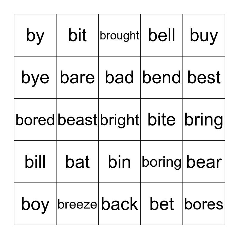 This bingo card has 25 words: bat, back, bad, boy, buy, by, bye, bit, bite, bin, bend, bored, boring, bear, bare, bores, bring, brought, best, beast, bright, breeze, bill, bell and bet.