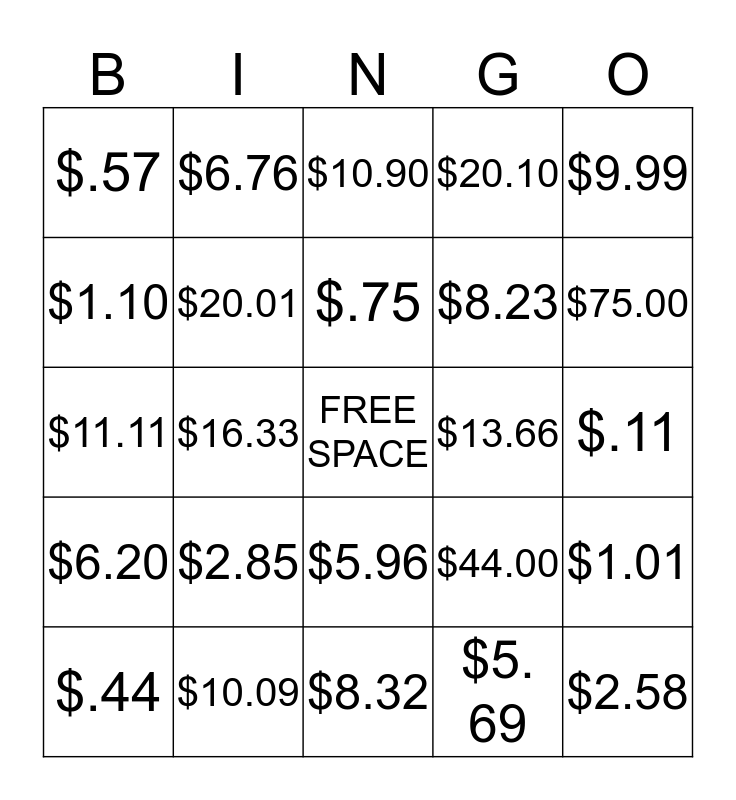 This bingo card has a free space and 24 words: $2.85, $10.09, $.75, $.44, $9.99, $.57, $1.10, $6.76, $13.66, $5.96, $8.23, $11.11, $44.00, $1.01, $20.01, $5. 69, $.11, $10.90, $75.00, $16.33, $2.58, $6.20, $20.10 and $8.32.