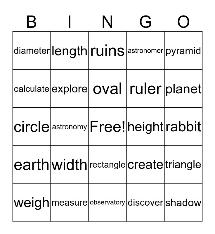 This bingo card has a free space and 24 words: width, measure, oval, weigh, pyramid, diameter, calculate, length, height, rectangle, ruler, circle, create, triangle, explore, discover, rabbit, ruins, planet, astronomy, shadow, earth, astronomer and observatory.