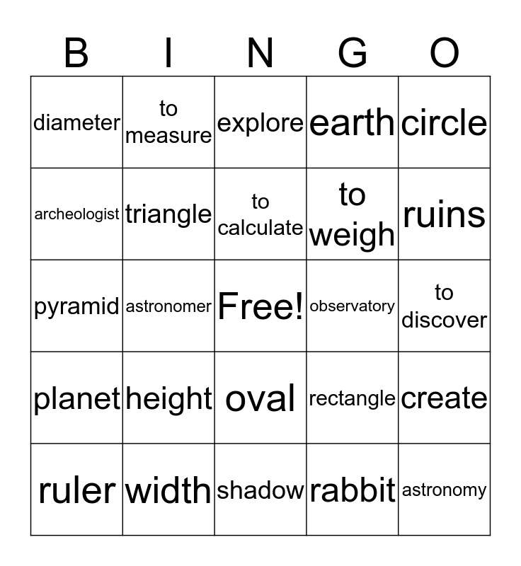 This bingo card has a free space and 24 words: height, width, to calculate, ruler, circle, diameter, archeologist, to measure, observatory, oval, to weigh, pyramid, rectangle, create, triangle, rabbit, to discover, explore, ruins, astronomer, astronomy, planet, earth and shadow.