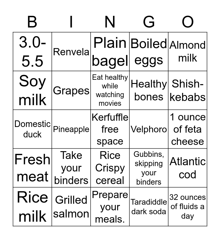 This bingo card has a free space and 24 words: Take your binders, Grilled salmon, Eat healthy while watching movies, Rice milk, Almond milk, 3.0-5.5, Soy milk, Renvela, Velphoro, Rice Crispy cereal, Healthy bones, Domestic duck, Gubbins, skipping your binders, Atlantic cod, Grapes, Taradiddle dark soda, 1 ounce of feta cheese, Plain bagel, Shish-kebabs, Pineapple, 32 ounces of fluids a day, Fresh meat, Boiled eggs and Prepare your meals..