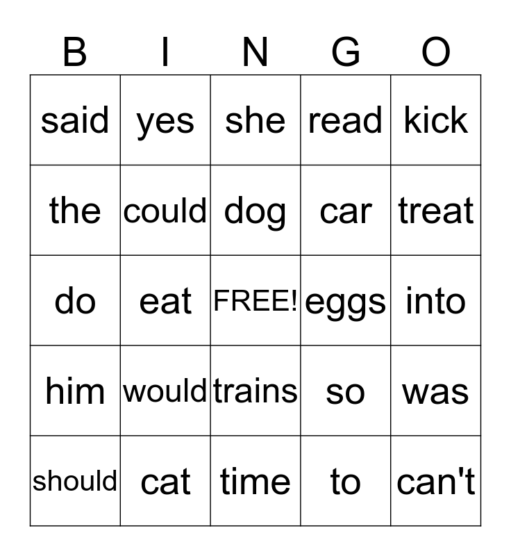This bingo card has a free space and 24 words: would, cat, dog, should, kick, said, the, yes, eggs, trains, car, do, so, was, could, to, into, she, treat, eat, can't, him, read and time.