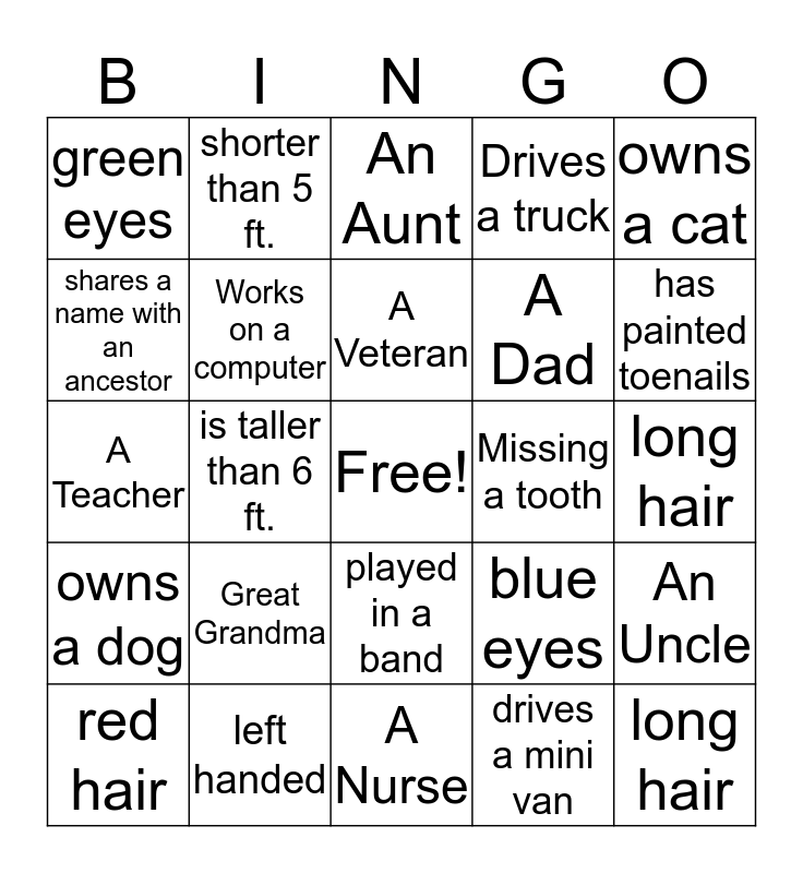 This bingo card has a free space and 24 words: red hair, Great Grandma, A Veteran, drives a mini van, owns a cat, green eyes, shorter than 5 ft., An Aunt, Missing a tooth, long hair, A Teacher, Works on a computer, blue eyes, An Uncle, shares a name with an ancestor, left handed, A Nurse, Drives a truck, has painted toenails, owns a dog, is taller than 6 ft., played in a band, A Dad and long hair.