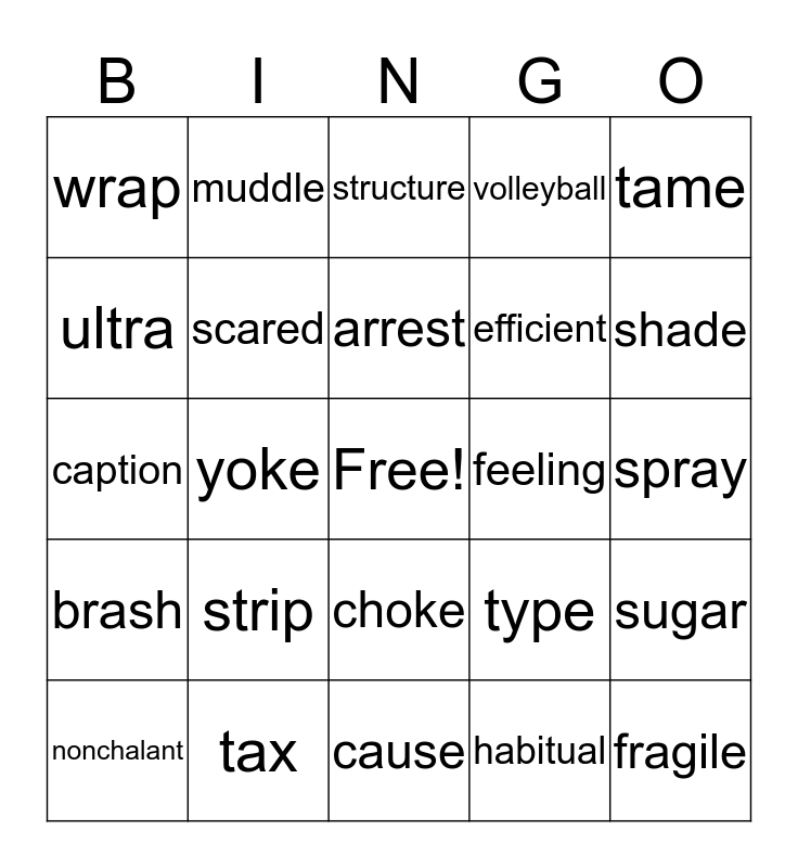 This bingo card has a free space and 75 words: canvas, complex, structure, vivacious, pink, boiling, humdrum, auspicious, trite, cup, clean, heavy, arrest, ultra, tasteful, yoke, pollution, fragile, witty, tame, zebra, caption, scared, muddle, volleyball, half, scarf, amusement, raspy, wipe, corn, shelter, calendar, type, shade, efficient, measly, serve, spray, habitual, believe, scattered, neat, rainstorm, thing, stale, nonchalant, wrap, smile, wretched, poke, choke, wicked, knock, condition, kick, noxious, tent, increase, vigorous, strip, partner, blink, prevent, leg, feeling, giants, reward, condemned, sugar, brash, tax, sneeze, cause and chilly.