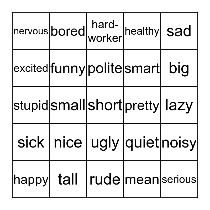 This bingo card has 25 words: nice, rude, polite, happy, sad, nervous, excited, bored, pretty, ugly, smart, stupid, quiet, noisy, funny, serious, lazy, hard-worker, big, small, short, tall, sick, healthy and mean.