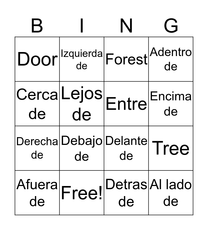 This bingo card has 16 words: Free!, Tree, Forest, Door, Derecha de, Izquierda de, Delante de, Detras de, Cerca de, Lejos de, Afuera de, Adentro de, Debajo de, Encima de, Entre and Al lado de.