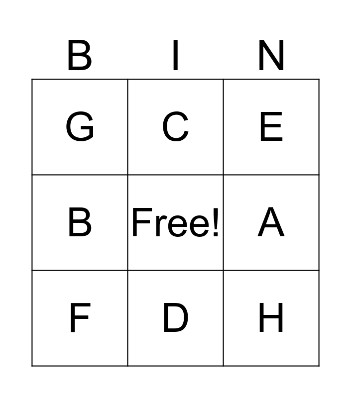 This bingo card has a free space and 8 words: A, E, C, F, G, H, B and D.