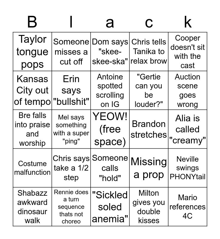 This bingo card has a free space and 24 words: Chris says take a 1/2 step, Rennie does a turn sequence thats not choreo, Antoine spotted scrolling on IG, Shabazz awkward dinosaur walk, Cooper doesn't sit with the cast, Taylor tongue pops, Kansas City out of tempo, Someone misses a cut off, Brandon stretches, Someone calls "hold", "Gertie can you be louder?", Bre falls into praise and worship, Missing a prop, Neville swings PHONYtail, Erin says "bullshit", Milton gives you double kisses, Alia is called "creamy", Dom says "skee-skee-ska", Auction scene goes wrong, Mel says something with a super "ping", Mario references 4C, Costume malfunction, Chris tells Tanika to relax brow and "Sickled soled anemia".