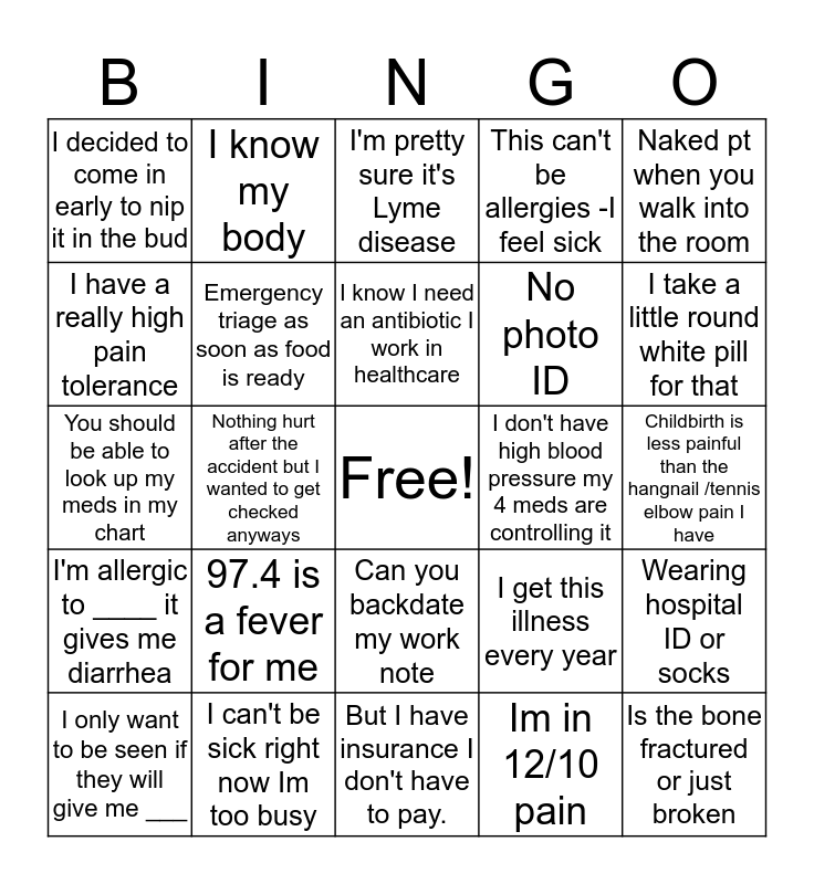 This bingo card has a free space and 24 words: 97.4 is a fever for me, I can't be sick right now Im too busy, I know I need an antibiotic I work in healthcare, I only want to be seen if they will give me ___, Naked pt when you walk into the room, I decided to come in early to nip it in the bud, I have a really high pain tolerance, I know my body, I don't have high blood pressure my 4 meds are controlling it, Can you backdate my work note, No photo ID, You should be able to look up my meds in my chart, I get this illness every year, Wearing hospital ID or socks, Emergency triage as soon as food is ready, Im in 12/10 pain, Childbirth is less painful than the hangnail /tennis elbow pain I have, I'm pretty sure it's Lyme disease, I take a little round white pill for that, Nothing hurt after the accident but I wanted to get checked anyways, Is the bone fractured or just broken, I'm allergic to ____ it gives me diarrhea, This can't be allergies -I feel sick and But I have insurance I don't have to pay..