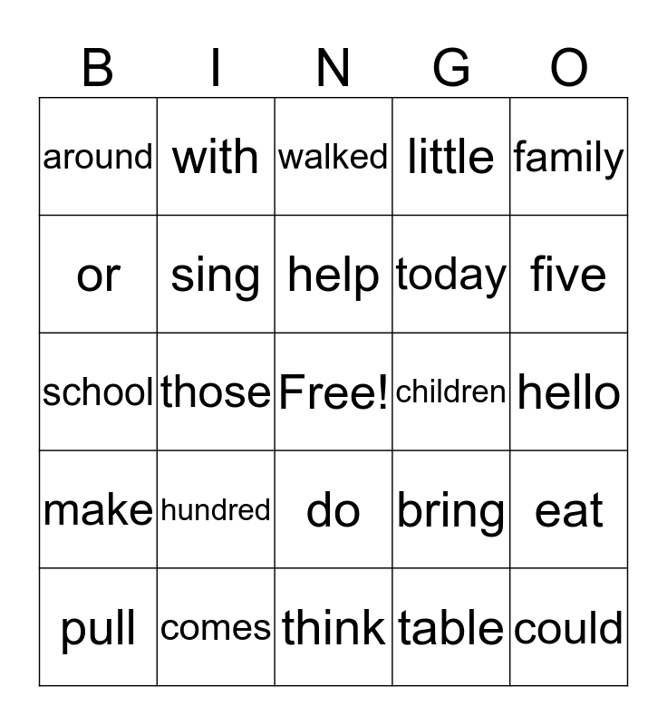 This bingo card has a free space and 25 words: hundred, think, help, pull, family, around, or, with, children, do, today, school, bring, eat, sing, until, hello, walked, five, those, could, comes, make, little and table.