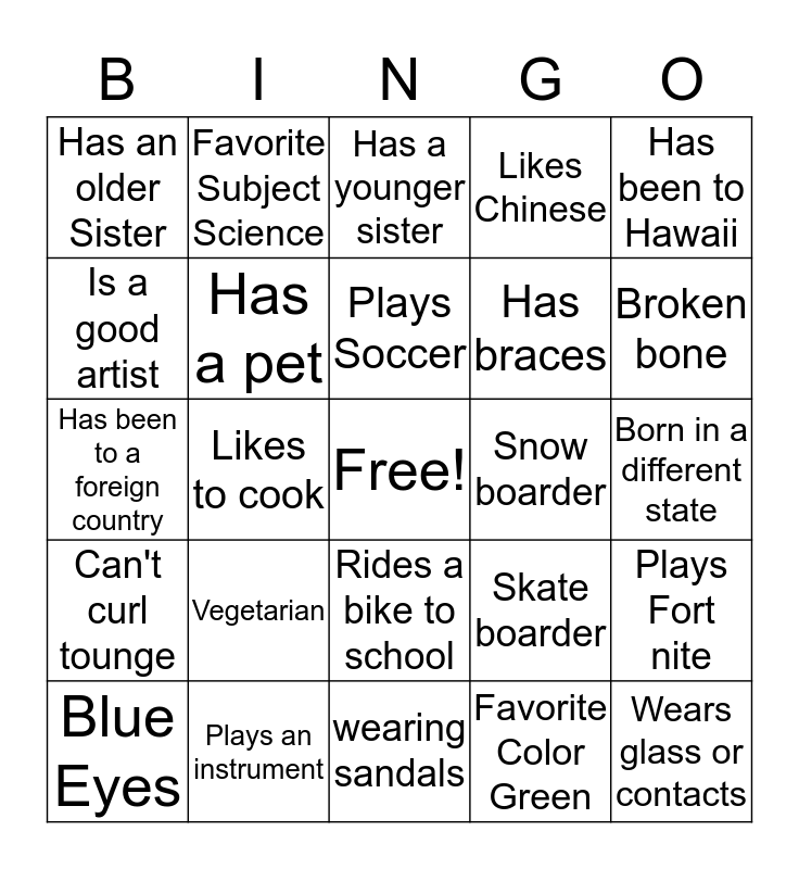 This bingo card has a free space and 24 words: Blue Eyes, Vegetarian, Plays Soccer, Favorite Color Green, Has been to Hawaii, Has an older Sister, Favorite Subject Science, Has a younger sister, Snow boarder, Born in a different state, Has been to a foreign country, Has a pet, Skate boarder, Plays Fort nite, Is a good artist, Plays an instrument, wearing sandals, Likes Chinese, Broken bone, Can't curl tounge, Likes to cook, Rides a bike to school, Has braces and Wears glass or contacts.