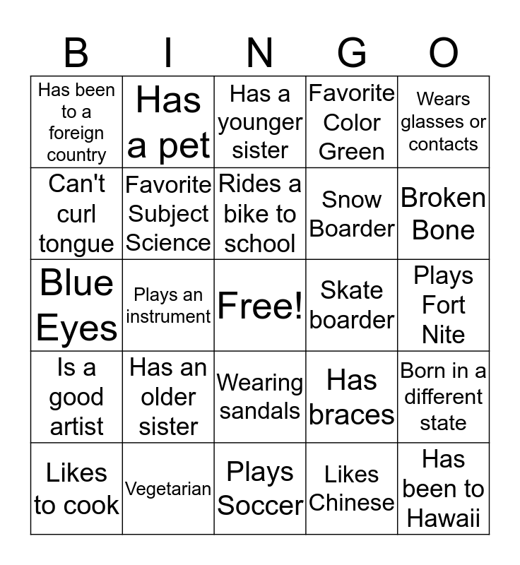 This bingo card has a free space and 24 words: Likes to cook, Has an older sister, Rides a bike to school, Likes Chinese, Wears glasses or contacts, Has been to a foreign country, Has a pet, Has a younger sister, Skate boarder, Plays Fort Nite, Blue Eyes, Favorite Subject Science, Has braces, Born in a different state, Can't curl tongue, Vegetarian, Plays Soccer, Favorite Color Green, Broken Bone, Is a good artist, Plays an instrument, Wearing sandals, Snow Boarder and Has been to Hawaii.