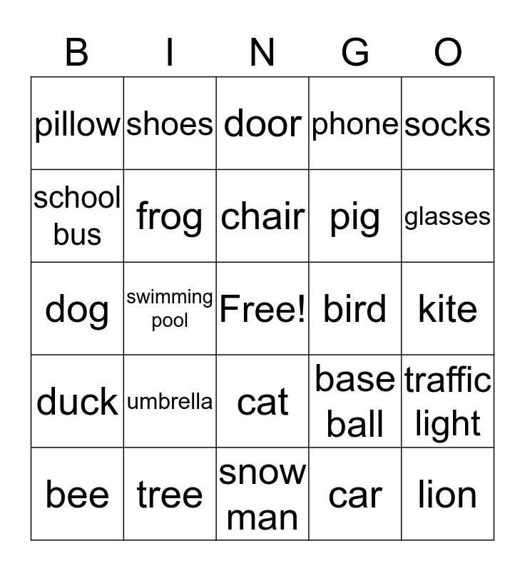 This bingo card has a free space and 24 words: umbrella, tree, chair, bee, socks, pillow, school bus, shoes, bird, cat, pig, dog, base ball, traffic light, frog, car, kite, door, glasses, swimming pool, lion, duck, phone and snow man.