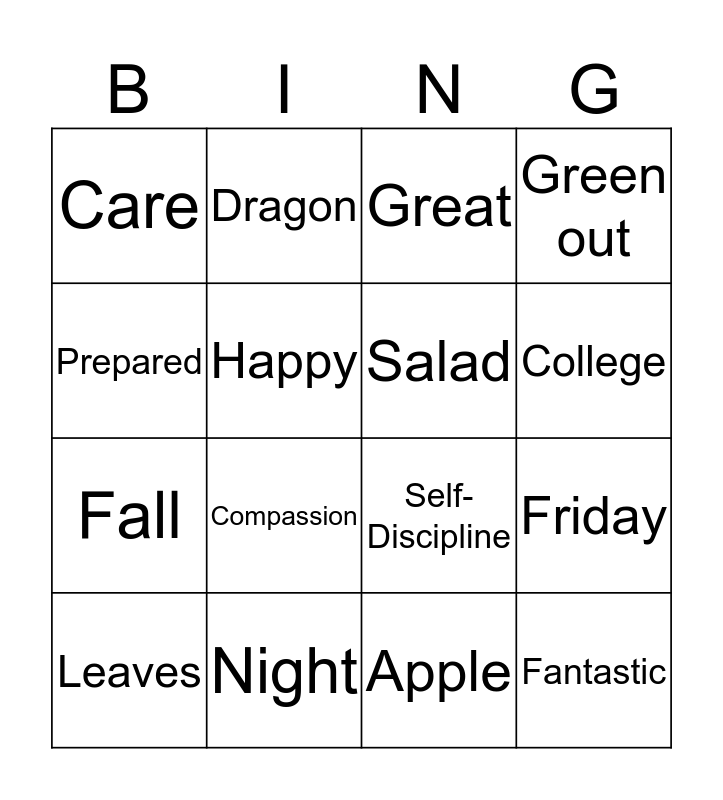 This bingo card has 72 words: Free!, Dragon, Friday, Pizza, Football, Texas, Green out, Pumpkin, Fall, Friend, Proud, Kindness, Compassion, Care, Integrity, Self-Discipline, Quietly, Prepared, Learning, Apple, Cool, Leaves, Autumn, Home, Sweater, Together, September, Honest, Cooperation, Learn, Read, Team, Tickle me Tuesday, Twitter Thursday, Rainy, Rachel’s Challenge, Braggin’, Birthdays, Happy, Terrific, Pledge, Lunch, Flag, America, Marvelous, Fantastic, Tremendous, Home, Awesome, News, Today, Picture, Breakfast, Night, Grove, Strong, Great, College, Tickets, Monday, Wednesday, Friday, Weekend, Sweater, Hot, Rain, Salad, Mac n Cheese, Grilled Cheese, Fruit, Yogurt Combo and Deli Bag.