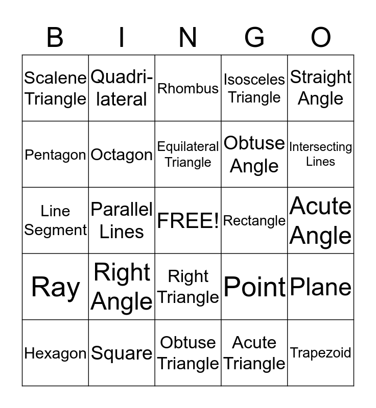 This bingo card has a free space and 24 words: Right Angle, Square, Equilateral Triangle, Hexagon, Straight Angle, Scalene Triangle, Pentagon, Quadri-lateral, Rectangle, Right Triangle, Obtuse Angle, Line Segment, Point, Plane, Octagon, Acute Triangle, Acute Angle, Rhombus, Intersecting Lines, Parallel Lines, Trapezoid, Ray, Isosceles Triangle and Obtuse Triangle.