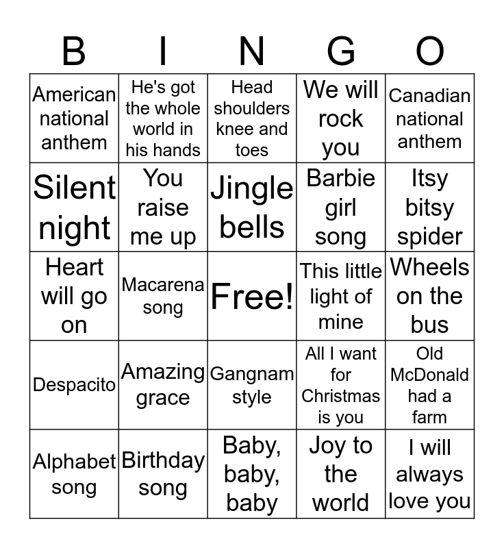 This bingo card has a free space and 24 words: Amazing grace, Birthday song, Jingle bells, Alphabet song, Canadian national anthem, American national anthem, Silent night, He's got the whole world in his hands, This little light of mine, Gangnam style, Barbie girl song, Heart will go on, All I want for Christmas is you, Old McDonald had a farm, You raise me up, Joy to the world, Wheels on the bus, Head shoulders knee and toes, Itsy bitsy spider, Macarena song, I will always love you, Despacito, We will rock you and Baby, baby, baby.