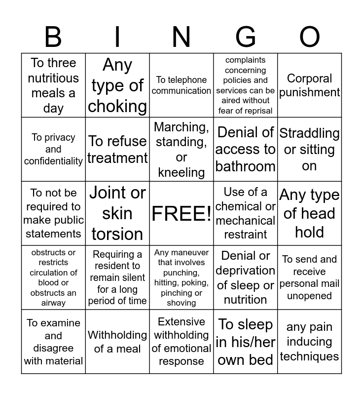 This bingo card has a free space and 24 words: Requiring a resident to remain silent for a long period of time, Withholding of a meal, Marching, standing, or kneeling, To examine and disagree with material, Corporal punishment, To three nutritious meals a day, To privacy and confidentiality, Any type of choking, Use of a chemical or mechanical restraint, Any maneuver that involves punching, hitting, poking, pinching or shoving, Denial of access to bathroom, To not be required to make public statements, Denial or deprivation of sleep or nutrition, To send and receive personal mail unopened, To refuse treatment, To sleep in his/her own bed, Any type of head hold, To telephone communication, Straddling or sitting on, Joint or skin torsion, any pain inducing techniques, obstructs or restricts circulation of blood or obstructs an airway, complaints concerning policies and services can be aired without fear of reprisal and Extensive withholding of emotional response.
