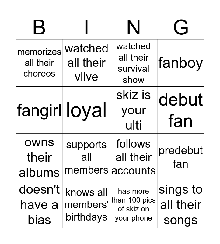 This bingo card has 16 words: knows all members' birthdays, predebut fan, watched all their survival show, memorizes all their choreos, owns their albums, watched all their vlive, follows all their accounts, has more than 100 pics of skiz on your phone, fangirl, loyal, doesn't have a bias, fanboy, supports all members, debut fan, skiz is your ulti and sings to all their songs.