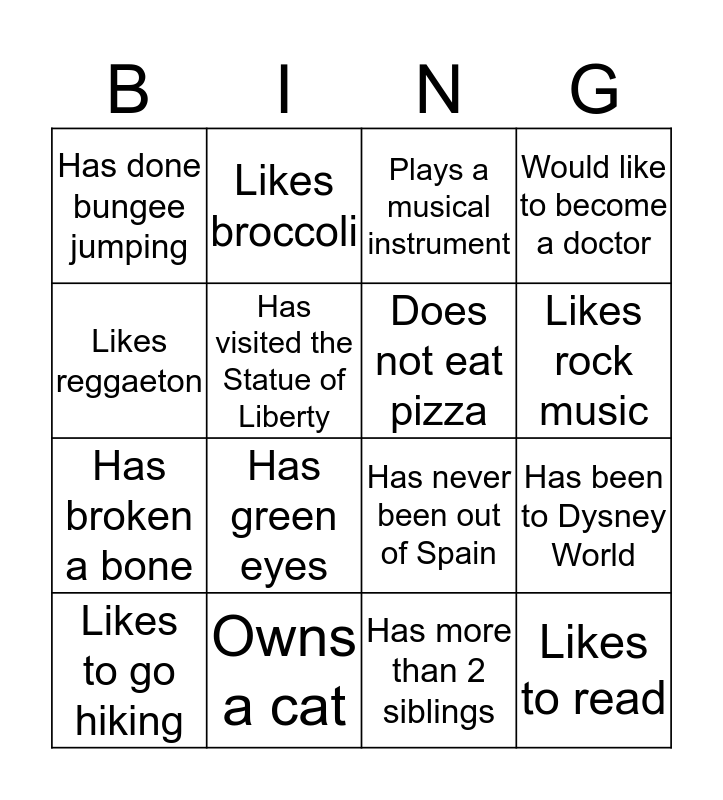 This bingo card has 16 words: Owns a cat, Has been to Dysney World, Plays a musical instrument, Has done bungee jumping, Has broken a bone, Likes broccoli, Has never been out of Spain, Has more than 2 siblings, Likes reggaeton, Has visited the Statue of Liberty, Likes to go hiking, Would like to become a doctor, Has green eyes, Likes rock music, Does not eat pizza and Likes to read.