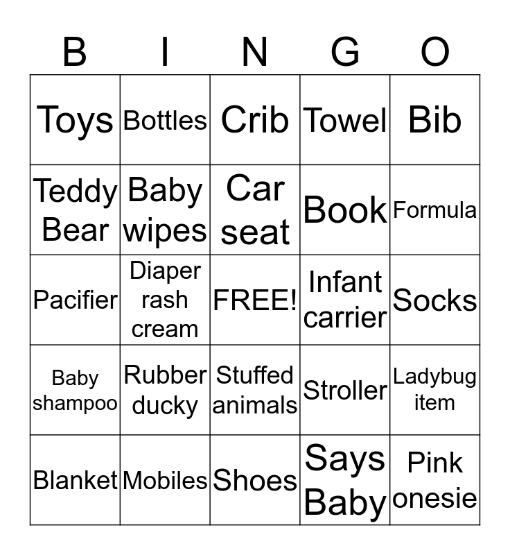 This bingo card has a free space and 33 words: Baby bathtub, Baby monitor, Diaper rash cream, Baby powder, Baby shampoo, Baby wipes, Bib, Blanket, Bottles, Burp cloth, Car seat, Crib, Diaper bag, Diapers, Infant carrier, Formula, Mobiles, Pacifier, Rubber ducky, Stroller, Stuffed animals, Teething rings, Toys, Socks, Shoes, Pink onesie, Towel, Book, Teddy Bear, Ladybug item, Says Girl, Says Baby and Nursery Rhyme.